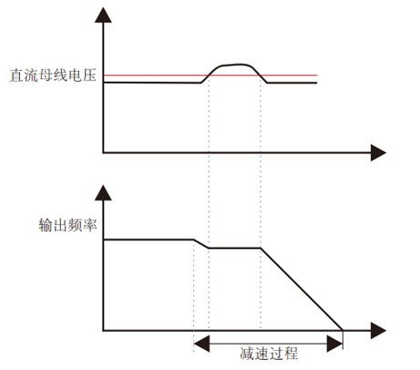 在減速過程中,當直流母線電壓超過設(shè)定值時,會根據(jù)你選擇的過壓保護模式保護變頻器。